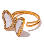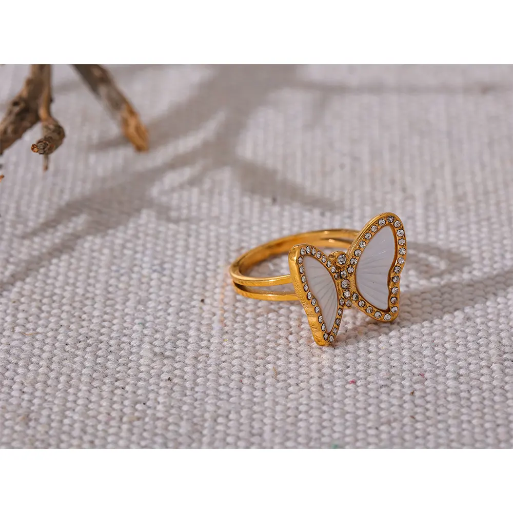 JINYOU 2826 Requintado Natural Shell CZ Anel De Borboleta De Aço Inoxidável Incrustado Cubic Zirconia Ouro Moda Jóias Acessórios